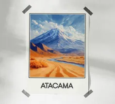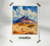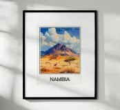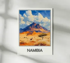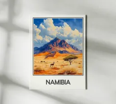 Una magnifica illustrazione che cattura la vastità del deserto del Namib, con le sue dune dorate e le imponenti montagne rocciose sullo sfondo. Uno springbok solitario attraversa la savana, mentre un albero iconico si erge sotto uno spettacolare cielo nuvoloso. Un poster ideale per una decorazione murale ispirata ai paesaggi africani.