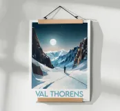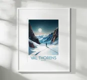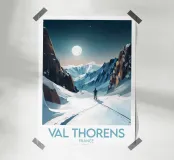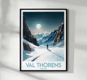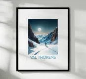 Scoprite la gelida bellezza della Val Thorens con questo poster notturno di grande ispirazione. Un'illustrazione pacifica di un escursionista che affronta le montagne innevate sotto la luna piena, ideale per una decorazione invernale contemplativa.