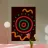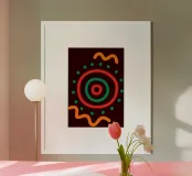 Un audace disegno astratto è caratterizzato da cerchi concentrici rossi e verdi, circondati da punti verdi. Due linee arancioni ondulate aggiungono un movimento dinamico alla composizione.