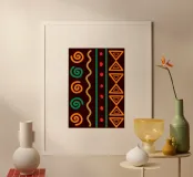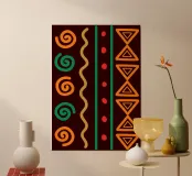 Audaci motivi geometrici con spirali, zigzag, punti e triangoli creano un vivace disegno simmetrico. I colori vivaci come l'arancione, il verde e il giallo contrastano formando un'immagine di grande impatto.