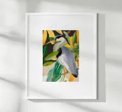 A painted depiction of a heron standing among natural greenery, rendered in soft, balanced tones.