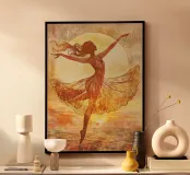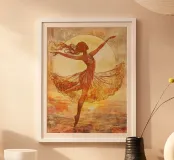 Das Bild zeigt eine Frau in einer anmutigen Tanzpose, ihr fließendes Kleid breitet sich in der Bewegung aus. Die Szene ist in warmen Farbtönen gehalten, die an einen Sonnenuntergang erinnern, mit der Sonne direkt hinter ihr, wodurch sie in ein goldenes Licht getaucht wird. Die künstlerische Textur verleiht dem Bild eine träumerische und fast gemalte Qualität, die die Stimmung noch mehr unterstreicht.