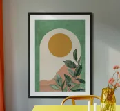 A dreamy boho-inspired artwork featuring an elegant arch framing mystical mountains, aesthetic foliage, and a glowing moon. The earthy tones and organic shapes create a calming, free-spirited ambiance.