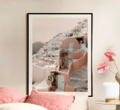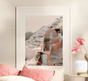 Alba su un villaggio bianco a Santorini - Oia, Grecia poster con telaio in legno
