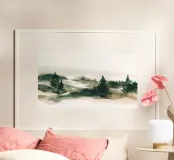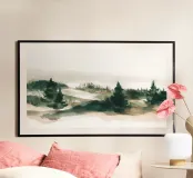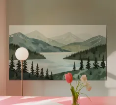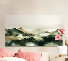 A wide, panoramic landscape rendered in soft watercolor layers of forest green, sage, and warm earth tones. Rolling hills and scattered evergreens dissolve gently into mist, creating a sense of depth and quiet distance. The loose, fluid brushwork keeps the scene atmospheric rather than literal, allowing the eye to drift across the composition. Calm and understated, this artwork suits modern, minimalist, and nature-inspired interiors, bringing a feeling of openness, stillness, and quiet horizon into the space.