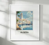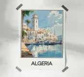 Poster artistico raffigurante un pittoresco porto dell'Algeria, con case bianche, barche ormeggiate e un cielo blu brillante. Un'atmosfera calda e mediterranea, perfetta per arricchire il vostro arredamento con un tocco marittimo e culturale.