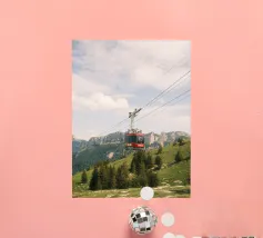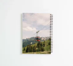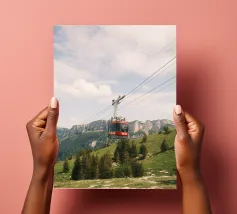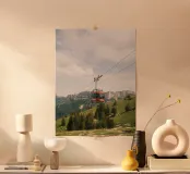 Una funivia in stile vintage scivola attraverso le Alpi svizzere mozzafiato, sospesa sopra prati verdeggianti punteggiati da alberi sempreverdi. Le drammatiche scogliere calcaree e il paesaggio alpino pastorale creano una miscela perfetta di avventura e tranquillità. Questa nostalgica scena di montagna cattura l'essenza del turismo alpino europeo e il fascino senza tempo delle ferrovie di montagna.
