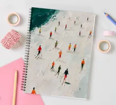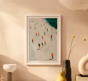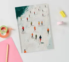 Quest'opera d'arte presenta un'espressiva veduta aerea di sciatori sparsi su una vasta pista innevata. Le pennellate ricche e tattili creano un senso di profondità e di movimento silenzioso, mentre accenti vibranti di arancione, rosso e verde punteggiano la pallida superficie invernale. Le piccole figure umane introducono ritmo e scala, trasformando una semplice scena di sci in un'esplorazione astratta di movimento, equilibrio e presenza. La composizione evoca una calma energia e la bellezza fugace dell'inverno, rendendola ideale per interni contemporanei e stampe artistiche di grande formato.