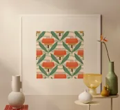 Fiore d'ispirazione moderna di metà secolo, con papaveri, foglie in grassetto e sfondo a griglia retrò nei toni smorzati dell'arancione, del verde e del beige.