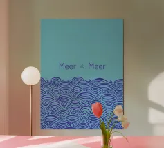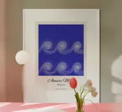 Disegno di onde bianche su sfondo blu. Sotto la scritta Amare Mare - Waves - Modern Art Exhibition.