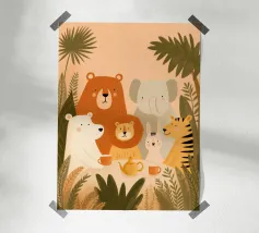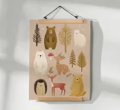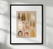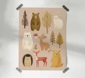 Un'affascinante illustrazione boschiva che raffigura una deliziosa collezione di animali della foresta su uno sfondo neutro e morbido. Gentili orsi dai toni caldi color caramello e crema, un cervo maculato, un dolce cerbiatto e un timido riccio sono circondati da alberi delicati, foglie e un buffo fungo rosso.