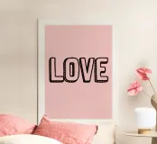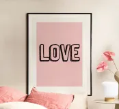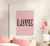 Grandi scritte nere in stile ricamo su uno sfondo rosa cipria per un messaggio chiaro e romantico. Minimalista e moderno, farà bella mostra di sé in salotto o in camera da letto e sarà un'ottima idea regalo.