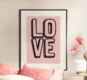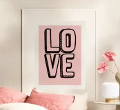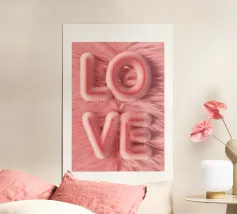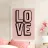 Scritte XXL ricamate in nero, disposte in blocchi "LOVE" su uno sfondo rosa cipria. Un'immagine pop e moderna che aggiunge un tocco romantico al soggiorno o alla camera da letto, ideale per una galleria a muro o per un regalo.