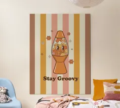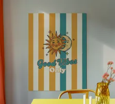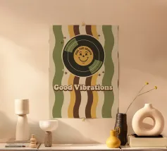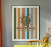 Celebrate lo spirito Flower Power con questo poster vintage retrò. Questo disegno psichedelico presenta un simbolo stilizzato di pace e amore circondato da fiori e note musicali. La tavolozza di toni pastello e terrosi su uno sfondo a righe crea un'atmosfera hippy chic unica. Lo slogan "Love & Harmony" incarna alla perfezione un'energia positiva e groovy.