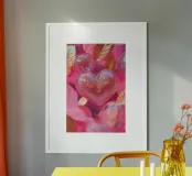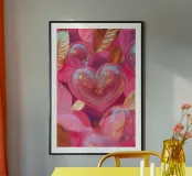 Stampa d'arte Cuore rosa con accenti oro e glitter - Quest'opera d'arte di grande impatto visivo presenta un cuore rosa scintillante su una superficie simile al vetro, circondato da foglie d'oro e bolle traslucide. I colori vivaci del rosa e dell'oro, combinati con una luce soffusa, creano un'atmosfera romantica e sognante. I dettagli intricati e le texture riflettenti dell'opera d'arte la rendono un regalo perfetto per gli amanti dell'arredamento moderno e stravagante e dell'arte romantica.