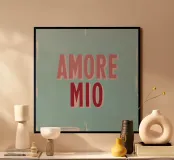 Questa audace opera d'arte retrò presenta la frase "Amore Mio" in un classico stile tipografico degli anni '50 con scritte rosa e rosse di grande effetto. Su uno sfondo turchese strutturato e macchiato, il disegno fonde il romanticismo vintage con il fascino pop della metà del secolo scorso. È giocoso, nostalgico e pieno di fascino, perfetto per stampe d'effetto, prodotti di ispirazione retrò o per gli amanti dell'estetica vintage. Con i suoi colori accattivanti e l'atmosfera old-school, questo disegno porta un tocco di freschezza senza tempo e di divertimento romantico in qualsiasi spazio.