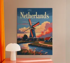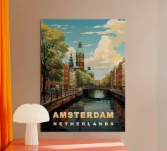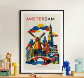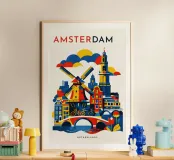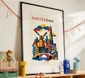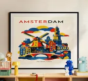 Una celebrazione audace e grafica di Amsterdam, resa attraverso una geometria pulita e vivaci blocchi di colore. Gli elementi iconici della città sono disposti in una composizione equilibrata, con silhouette decise e dettagli giocosi che creano profondità e ritmo. Il risultato è vivace e accogliente, e cattura il carattere di Amsterdam senza ricorrere a dettagli letterali.