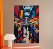 Quest'opera d'arte cattura il fascino unico del Camden Market con il suo audace stile espressionista. I colori vivaci - rosso, blu e giallo - infondono energia al dipinto, mostrando le vivaci bancarelle e la folla eterogenea del mercato. Le pennellate dinamiche creano un senso di movimento ed eccitazione, celebrando la vivacità culturale di questa iconica destinazione londinese. Il gioco di colori e texture offre una nuova prospettiva su un amato punto di riferimento urbano.