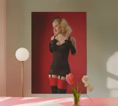 Una giovane donna in lingerie e calze nere