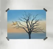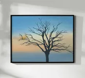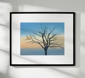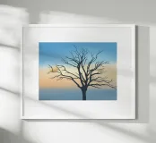 La silhouette di un albero senza foglie si staglia su un cielo sfumato che passa dall'azzurro ai toni caldi dell'arancio e del giallo. I rami si estendono in modo intricato, creando un contrasto drammatico ed enfatizzando il cielo sereno.
