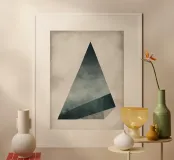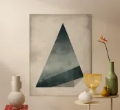 Un'immagine minimalista di una piramide tridimensionale nei toni polverosi del grigio, del beige e del blu.