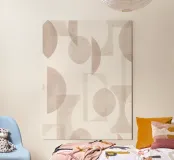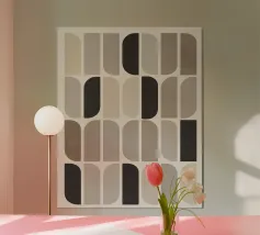 Il disegno presenta un'accattivante disposizione di cerchi, rettangoli e forme astratte di foglie sovrapposte, che alludono sottilmente a forme organiche all'interno della struttura. La texture granulosa aggiunge profondità e interesse visivo.