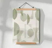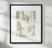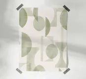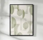 Il disegno presenta un'accattivante disposizione di cerchi, rettangoli e forme astratte di foglie sovrapposte, che alludono sottilmente a forme organiche all'interno della struttura. La texture granulosa aggiunge profondità e interesse visivo.