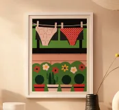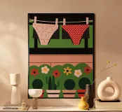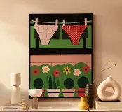 L'illustrazione "Drying Underwear" presenta un design minimalista ed estetico che raffigura la biancheria intima appesa ad asciugare.