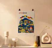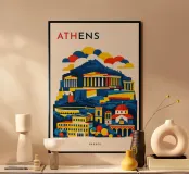 Un tributo audace e grafico ad Atene, che fonde il patrimonio antico con il linguaggio del design contemporaneo. Forme classiche iconiche si ergono su una collina stratificata, con silhouette decise rese da geometrie pulite e blocchi di colore decisi. La composizione bilancia storia e modernità, catturando la presenza senza tempo della città senza ricorrere a dettagli architettonici raffinati.