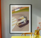 Illustrazione di un'auto da corsa su una pista con uno stile geometrico moderno.