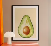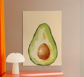 Una dolce e semplice illustrazione di mezzo avocado su uno sfondo a griglia rosa pastello. Perfetta per le pareti di asili nido, stanze di bambini o decorazioni giocose per la cucina. I colori tenui e il design amichevole lo rendono ideale per creare uno spazio allegro e accogliente.