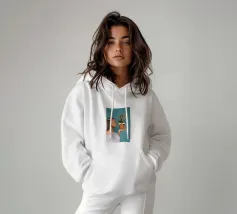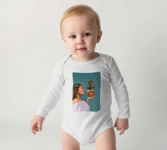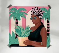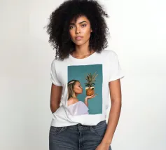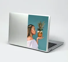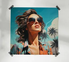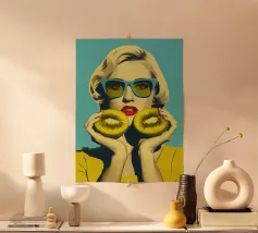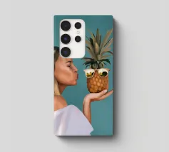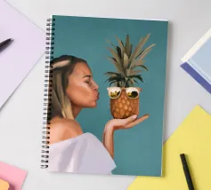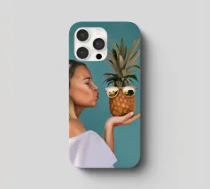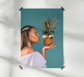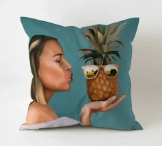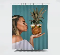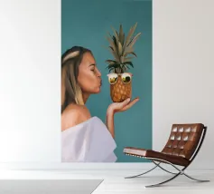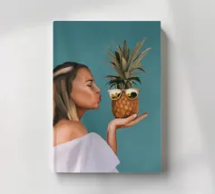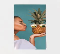 Una giocosa illustrazione tropicale di una donna che soffia un bacio a un ananas con gli occhiali da sole, su un ventilato sfondo verde acqua. Questa opera d'arte divertente e stravagante cattura le vibrazioni spensierate dell'isola e le personalità solari: perfetta per gli amanti della spiaggia, per gli interni audaci e per coloro che vivono la vita con un tocco di umorismo e fascino.