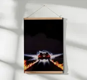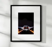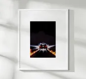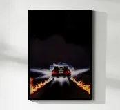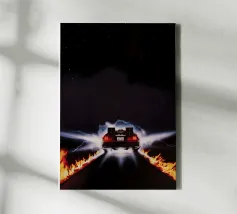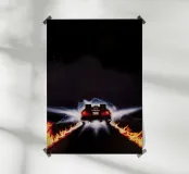 Un'auto futuristica sfreccia nella notte, lasciando dietro di sé scie infuocate sotto un cielo stellato.