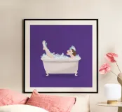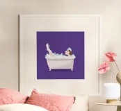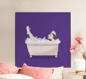Illustrazione di una donna nella vasca da bagno. Il motivo è realizzato su sfondo trasparente. In questo modo puoi scegliere il tuo colore di sfondo preferito. Se non ti piace il viola, sostituiscilo con un altro colore.