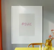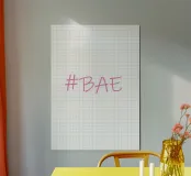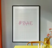 Questa immagine è un design grafico semplice e moderno con l'hashtag "BAE" in un font rosa tenue in stile scrittura.
