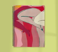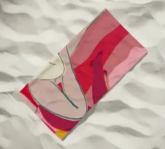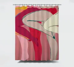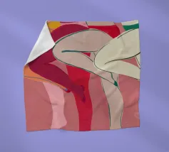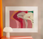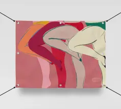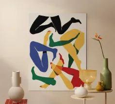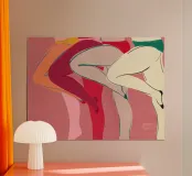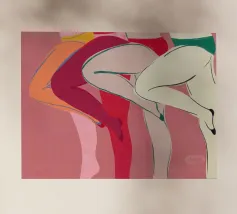 Una varietà di forme e colori astratti si uniscono per suggerire la forma di gambe umane in uno stile dinamico e moderno. I rossi, i rosa e gli arancioni vibranti dominano la composizione, mentre le linee che si intersecano creano un effetto energico e disarticolato.
