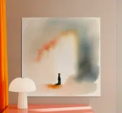 Un bambino in abiti scuri è immobile in un ambiente mistico, di fronte a un gradiente di colore che contrasta con la nebbia ombrosa. La scena è tranquilla e allo stesso tempo profonda, e suscita un pensiero profondo.