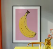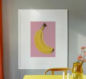Una banana, stampa Risograph con texture granulosa, una semplice illustrazione piatta in stile arte vettoriale, su sfondo rosa, stampata con inchiostro Risograph.