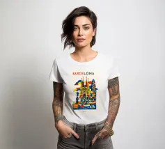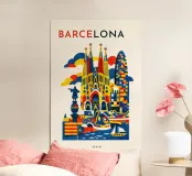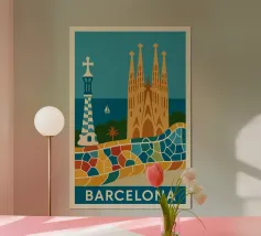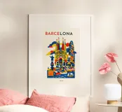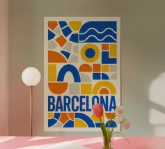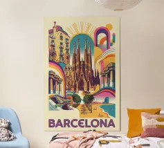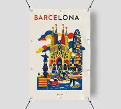 A vibrant, graphic celebration of Barcelona, brought to life through bold geometry and energetic colour blocking. Iconic architectural forms rise in layered harmony, blending historic landmarks with the city’s unmistakable creative spirit. Playful shapes, rhythmic patterns, and confident contrasts give the composition movement and warmth, capturing Barcelona’s expressive character without relying on fine detail.