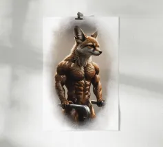 A shirtless humanoid figure wearing an animal-shaped mask stands solemnly in dim, dramatic lighting, evoking mystery and symbolism. The scene is set against a plain, dark fabric backdrop, highlighting a surreal and artistic atmosphere.