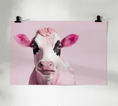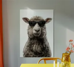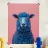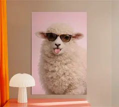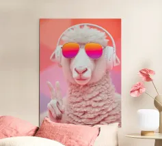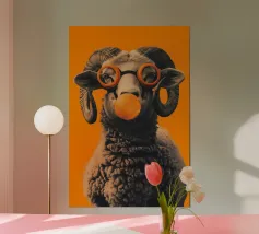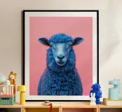 Un'immagine sorprendente di una pecora blu surreale con lana strutturata, che si staglia su uno sfondo rosa brillante. L'audace contrasto cromatico e la composizione minimalista creano un'estetica giocosa e moderna.