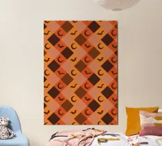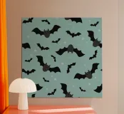 I pipistrelli dei cartoni animati con facce sorridenti volano su uno sfondo blu-verde disseminato di piccole stelle. Il design giocoso crea un'atmosfera stravagante e divertente.