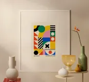 Vibrante stampa del manifesto della mostra Bauhaus del 1923. Presenta una dinamica composizione geometrica astratta con cerchi, quadrati, triangoli e altre forme in colori audaci e contrastanti. Rappresenta le diverse esplorazioni del design dell'iconica mostra. File artistico digitale di alta qualità (7000x5000px, 300 dpi) per riproduzioni straordinarie. Perfetta arte da parete colorata retrò e moderna.