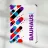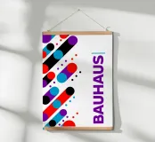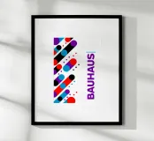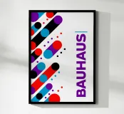 Un poster astratto altamente dinamico ed energico, ispirato ai principi geometrici del Bauhaus e al pop visivo del design grafico del Mid-Century. Il lato sinistro presenta un motivo diagonale e ripetuto di rettangoli arrotondati (capsule) riempiti con un mix di cerchi rossi, blu ciano, viola e neri, su un nitido sfondo bianco. Piccoli punti sparsi nei colori corrispondenti rafforzano la sensazione cinetica del disegno. Il lato destro è dedicato alla tipografia verticale e audace, con la parola "BAUHAUS" visualizzata in un grande carattere sans-serif viola. Questo poster digitale di qualità superiore (7000x5000 px, 300 dp