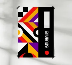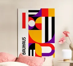 Uno straordinario poster astratto a orientamento verticale che incarna appieno il vocabolario visivo del movimento Bauhaus. La composizione è una disposizione dinamica di audaci forme geometriche, tra cui archi, quarti di cerchio e strisce, utilizzando una tavolozza ad alto contrasto di rosso, giallo, viola, nero e bianco. Il disegno crea un volto o una figura astratta complessa e interconnessa. La parola "BAUHAUS" è posizionata verticalmente lungo il bordo sinistro. Questa arte digitale di alta qualità (7000x5000 pixel, 300 dpi) garantisce colori vivaci e dettagli nitidi, rendendola un'eccellente opera d'arte moderna e grafica.