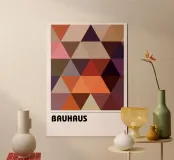 Immergetevi nel vibrante mondo del Bauhaus con questo accattivante poster astratto. Il disegno presenta una griglia dinamica di triangoli che si intersecano tra loro, con una sofisticata tavolozza di colori che comprende marroni, rossi intensi, arancioni, rosa e viola. Questa composizione a mosaico crea un motivo visivamente stimolante, che incarna perfettamente i principi geometrici e l'esplorazione dei colori caratteristici del movimento Bauhaus. L'iconica scritta "BAUHAUS" caratterizza il pezzo, rendendo omaggio alle sue origini artistiche. Resa a un'impressionante risoluzione di 7000x5000 pixel a 300 dpi, questa opera d'arte digitale di alta qualità è stata realizzata con un'immagine di
