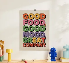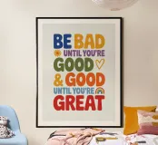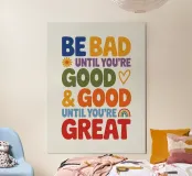 Poster tipografico allegro e motivante in stile retrò: lettere colorate in blu, giallo, verde, arancione e rosso combinate con piccole illustrazioni come un fiore, un cuore e un arcobaleno. Perfetto per le stanze dei bambini, li ispira ad andare avanti e a crescere.