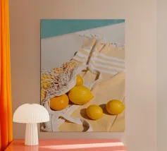 Stampa d'arte con cornice in legno di alta qualità raffigurante una scena estiva rilassante con limoni su telo bianco sulla sabbia. Ideale per dare un tocco fresco e naturale a soggiorno o cucina, perfetta come idea regalo per amanti dello stile mediterraneo e della decorazione moderna.