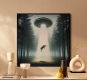 A surreal and cinematic depiction of a UFO beaming a cow into its craft in a foggy forest. The dramatic light contrasts with the dark silhouettes of the tall trees, creating an eerie and otherworldly atmosphere.