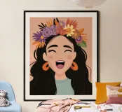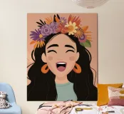 Questo dipinto raffigura una persona con un abito floreale colorato e lunghi capelli neri, su uno sfondo arancione. I fiori vivaci e il vestito fluente evocano un senso di crescita e bellezza.